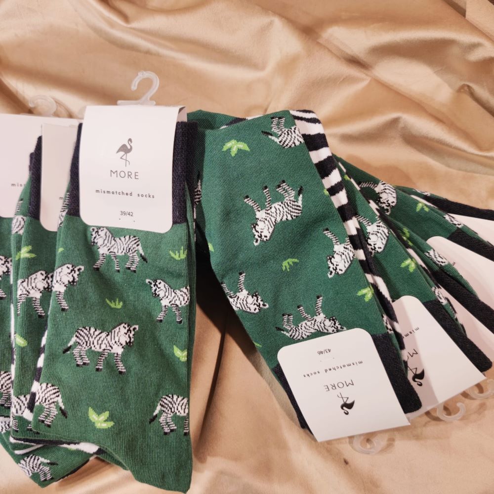 Każda para skarpetek z tej kolekcji to prawdziwe dzieło sztuki – na jednej stopie znalazła się piękna zielona polana, a na drugiej biało-czarne cętki zebry. To zestawienie kolorów i wzorów sprawia, że skarpety te są nie tylko funkcjonalne, ale także pełne charakteru i stylu. Bez względu na to, czy nosisz je na co dzień, czy wybierasz się na wyjątkową okazję, długie skarpetki MORE będą doskonałym uzupełnieniem Twojej garderoby.