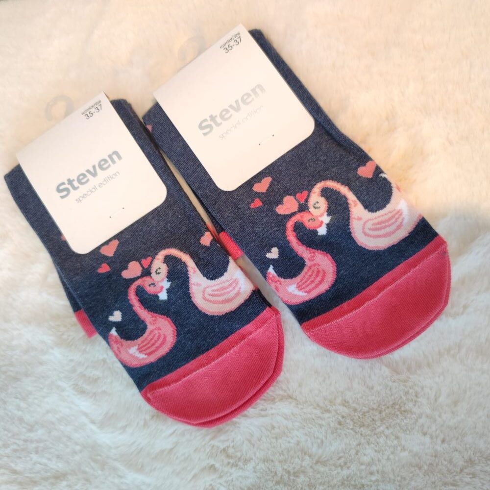 Motyw przytulających się łabędzi to prawdziwy hit, który z pewnością przyciągnie wzrok i wywoła uśmiech na twarzy każdej kobiety. Te eleganckie ptaki symbolizują miłość, lojalność i harmonię, co czyni je idealnym motywem na Walentynki. Subtelne zdobienia oraz ładne kolory sprawiają, że skarpety doskonale wpisują się w różnorodne stylizacje. Można je nosić zarówno do casualowych, jak i bardziej eleganckich outfitów, a ich uniwersalność sprawia, że stanowią doskonały dodatek do każdej garderoby.