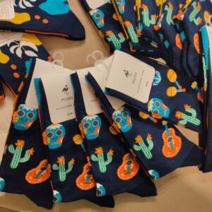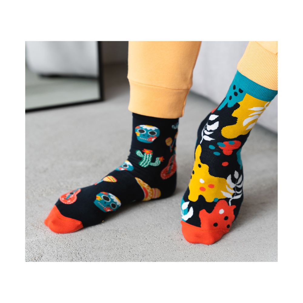 Jednak Meksyk to nie tylko kolorowe festiwale i wspaniałe jedzenie. Kultura meksykańska ma także głębokie i refleksyjne podejście do życia i śmierci. Dia de Los Muertos, czyli Dzień Zmarłych, to jedno z najważniejszych świąt w Meksyku, które odbywa się przez trzy dni. W tym czasie Meksykanie oddają hołd swoim przodkom, celebrując życie i pamięć zmarłych. Skarpetki Mexico nawiązują do tej tradycji, wprowadzając na swoje wzory motywy trupich czaszek, które, w przeciwieństwie do powszechnych skojarzeń, symbolizują radość i ponowne narodziny.