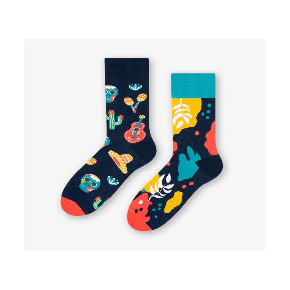 Meksyk to kraj pełen kontrastów, gdzie tradycja spotyka nowoczesność, a piękno natury harmonizuje z bogactwem kultury. Od malowniczych plaż po tętniące życiem miasta, Meksyk jest źródłem inspiracji dla artystów i projektantów. Skarpetki Mexico przenoszą ten klimat prosto na Twoje stopy. Wzory na skarpetkach odzwierciedlają bogactwo meksykańskiej kultury – od charakterystycznych sombrero, przez olbrzymie kaktusy, aż po dźwięki gitary i elementy kuchni meksykańskiej, które wprowadzą do Twojego stroju nutę egzotyki.